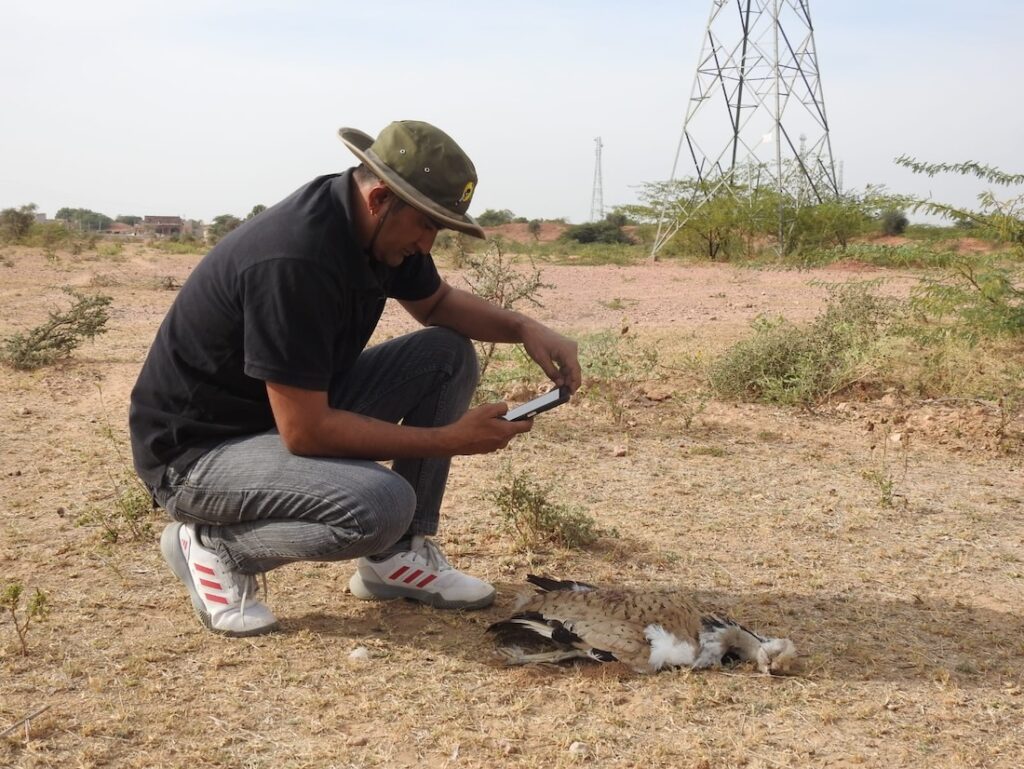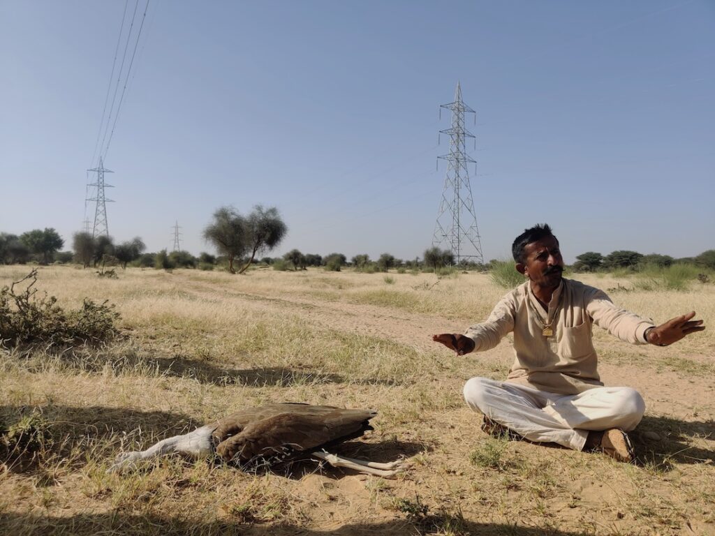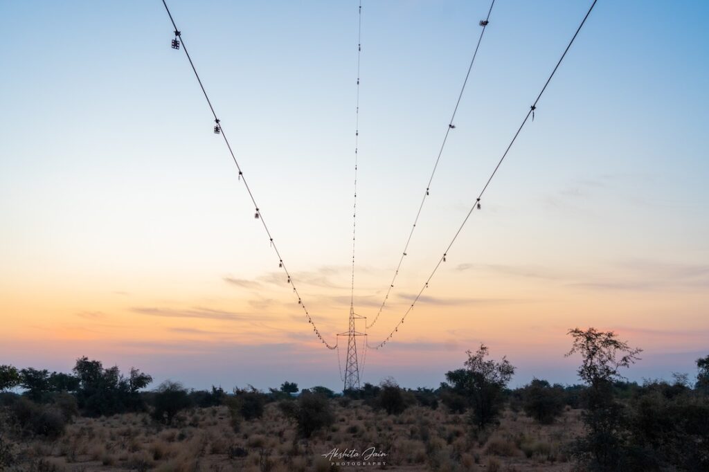 Every year, hundreds of birds suffer tragic deaths in Rajasthan’s Thar Desert on coming into contact with the lethal network of high-tension power lines criss-crossing the desert landscape. Death occurs due to collision or electrocution. Bustards like the Great Indian bustards (GIBs) and the MacQueen’s bustards are especially vulnerable to such accidents. With their eyes positioned on either side of the head, these birds lack good frontal vision, which makes it difficult for them to detect power lines in their flight path. Often, by the time they see the obstruction, it is too late. They are heavy-bodied birds that are unable to swiftly manoeuvre direction to avoid collision. The physical force of the impact usually kills or grievously injures them.