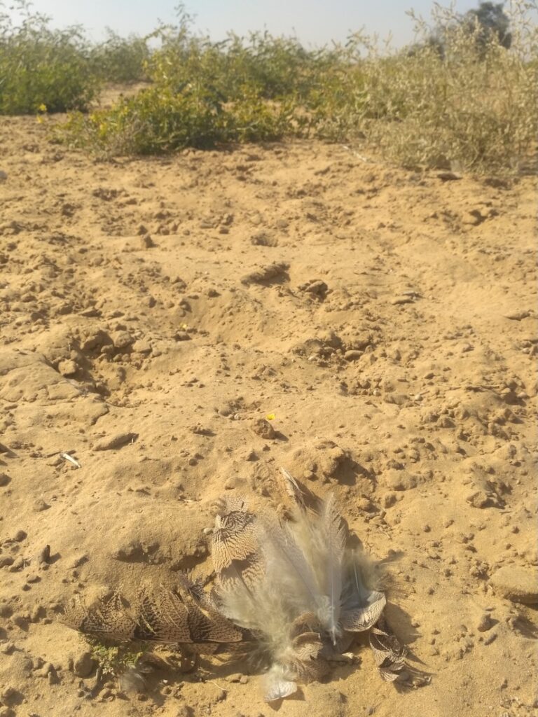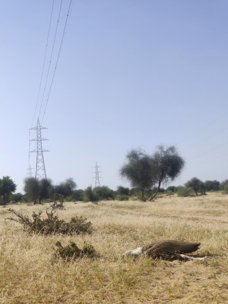 This incident was not an isolated or a rare event. In November 2019, Dr. Sujit Narwade, Deputy Director of BNHS and Coordinator of the Bustard and Florican program, documented a similar distressing situation involving a MacQueen’s bustard in Khetolai, a small village near the town of Pokhran in the Jaisalmer District. Here, too, the bird had died upon colliding with a power line.